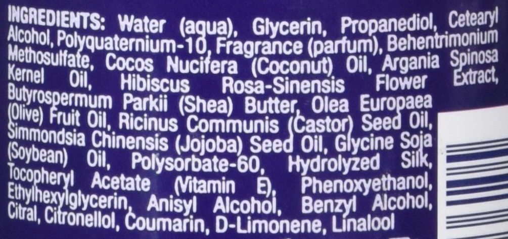 Water (Aqua), Glycerin, Propanediol, Cetearyl Alcohol, Polyquaternium-10, Fragrance (Parfum), Behentrimonium Methosulfate, Cocos Nucifera (Coconut) Oil, Argania Spinosa Kernel Oil, Hibiscus Rosa-Sinesis Flower Extract, Butyrospermum Parkii (Shea) Butter, Olea Europaea (Olive) Fruit Oil, Ricinus Communis (Castor) Seed Oil, Simmondsia Chinensis (Jojoba) Seed Oil, Glycine Soja (Soybean) Oil, Polysorbate-60, Hydrolyzed Silk, Tocopheryl Acetate (Vitamin E), Phenoxyethanol, Ethylhexylglycerin, Anisyl Alcohol, Benzyl Alcohol, Citral, Citronellol, Coumarin, D-Limonene, Linalool